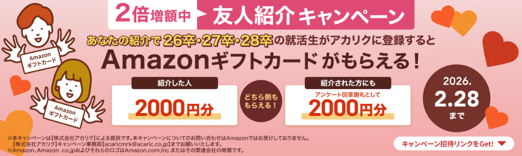 アカリクは理系学生の学部2年生と3年生と4年生、修士1年生と2年生、博士1年生(26.27.28卒)を対象に条件をクリアすると2000円分のAmazonギフトカードがもらえるキャンペーンを期間限定で実施しています。
