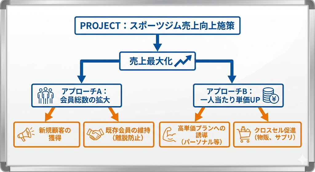 例えば、「スポーツジムの売上を上げてください」というお題が出たとします。 ここでいきなり、